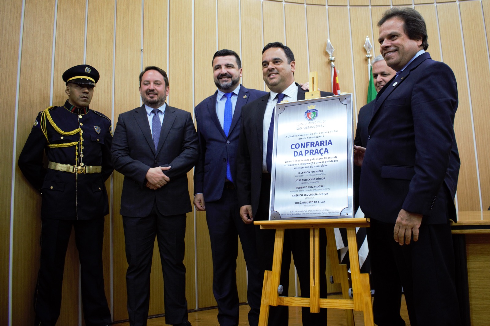 Ao abrir a sessão solene, o presidente da Câmara, professor Pio Mielo (PSDB), ressaltou a importância da Confraria da Praça para a cidade. “A Confraria é uma referência para nossa cidade pelo trabalho no desenvolvimento econômico de São Caetano e pelo engajamento na área social. A história da Confraria da Praça, passa e passará por cada um dos presentes nessa sessão”, disse. “Nessa noite, o poder público cumpre seu papel com essa merecida reverência”, afirmou Pio Mielo.