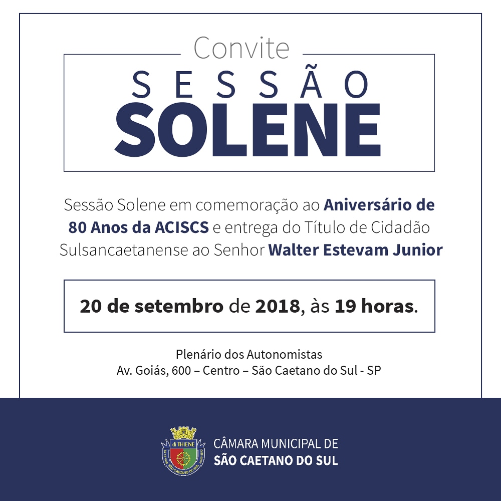 A Câmara de São Caetano do Sul comemora os 80 anos de fundação da Associação Comercial e Industrial de São Caetano do Sul (Aciscs) na próxima quinta-feira, 20. Na oportunidade, será homenageado o presidente da entidade, doutor Walter Estevam Junior, com a entrega do título de Cidadão Sulsancaetanense, iniciativa da vereadora Suely Nogueira.